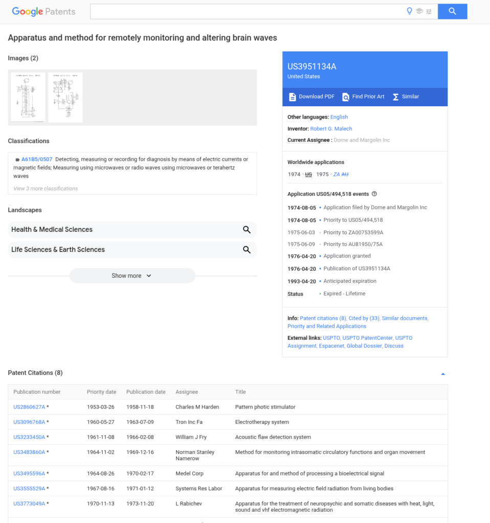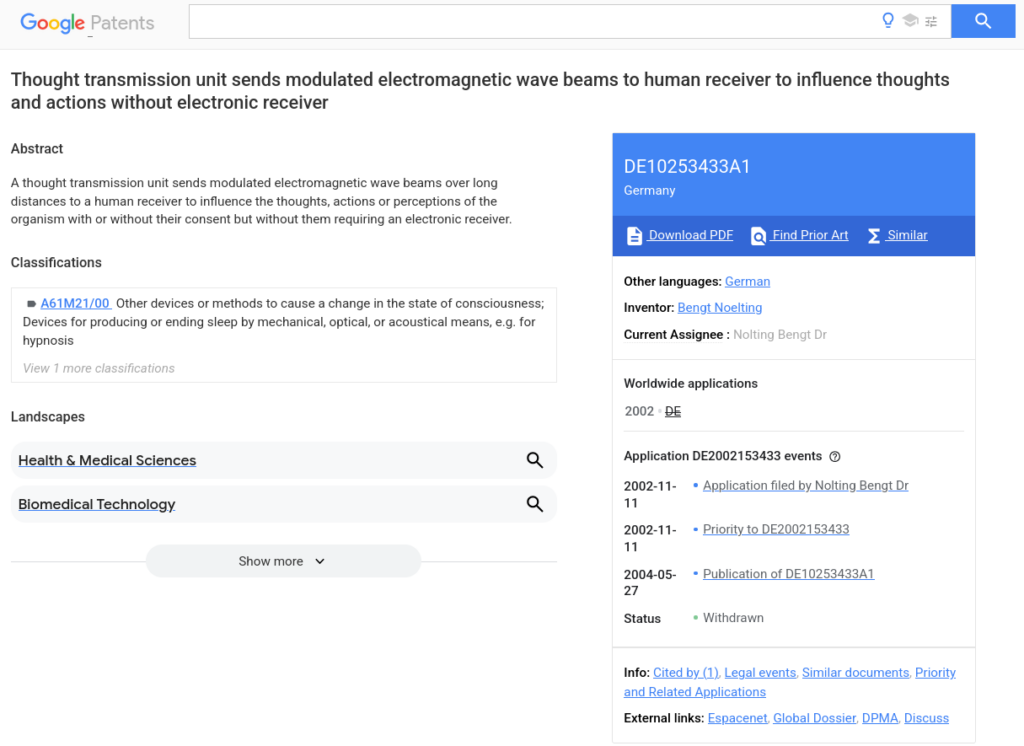 Quelques Brevets publiés et hébergés sur Google Patent qui montrent que cette maladie peut être entièrement synthétique. Un opérateur bien caché, vise et fait subir à sa cible, à distance, les symptômes de plusieurs maladies dont la schizophrénie.